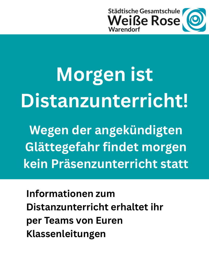 Morgen findet wegen der angekündigten Wetterlage kein Präsenzunterricht statt. Ab 7:45 Uhr findet deshalb Distanzunterricht per Teams statt.